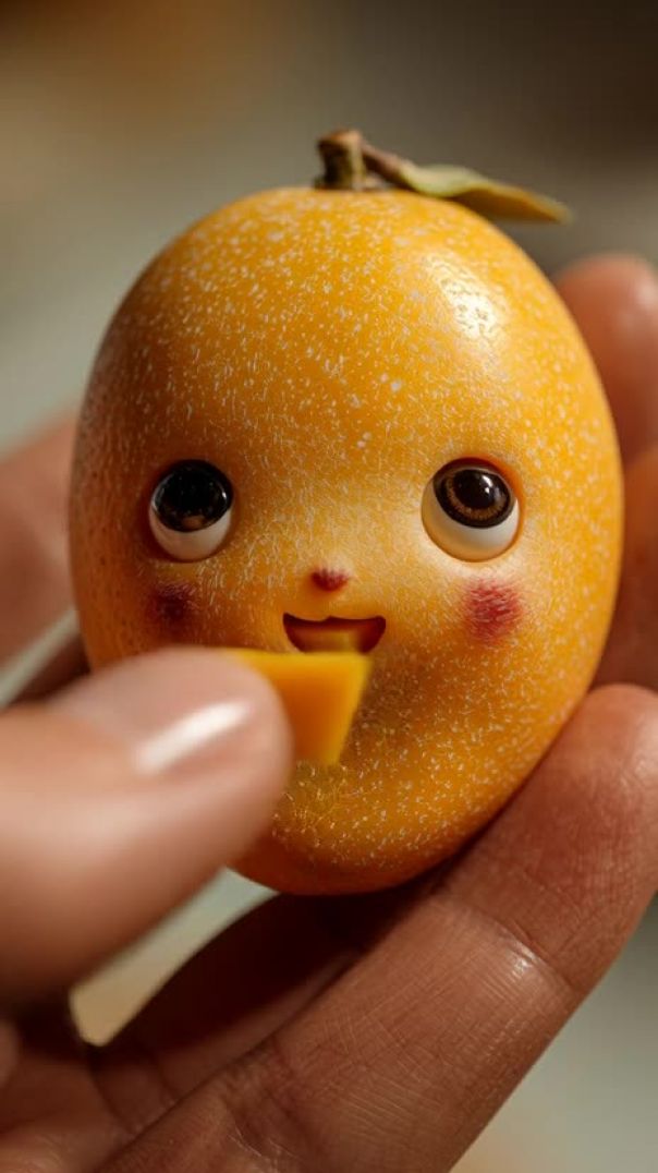 Animate only gentle, tiny movements: the FOOD-embedded baby-face blinks softly, its stylized mouth slowly opens in anticipation as a hand brings a small piece of FOOD toward it. The FOOD creature leans forward slightly to reach the bite, takes a small nibble with a soft mouth motion, and shows subtle cheek squish followed by delicate chewing. Add faint happy micro-expressions and minimal slow breathing, keeping all motions smooth, cute, and delicately understated.