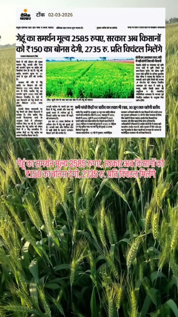 सरकार ने गेहूं पर ₹150 प्रति क्विंटल बोनस देने का फैसला किया है।