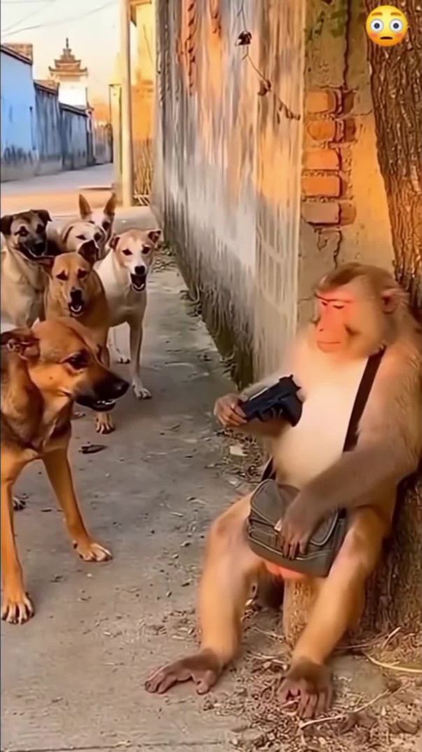 ⁣Monkey fired the gun and chased away all the dogs