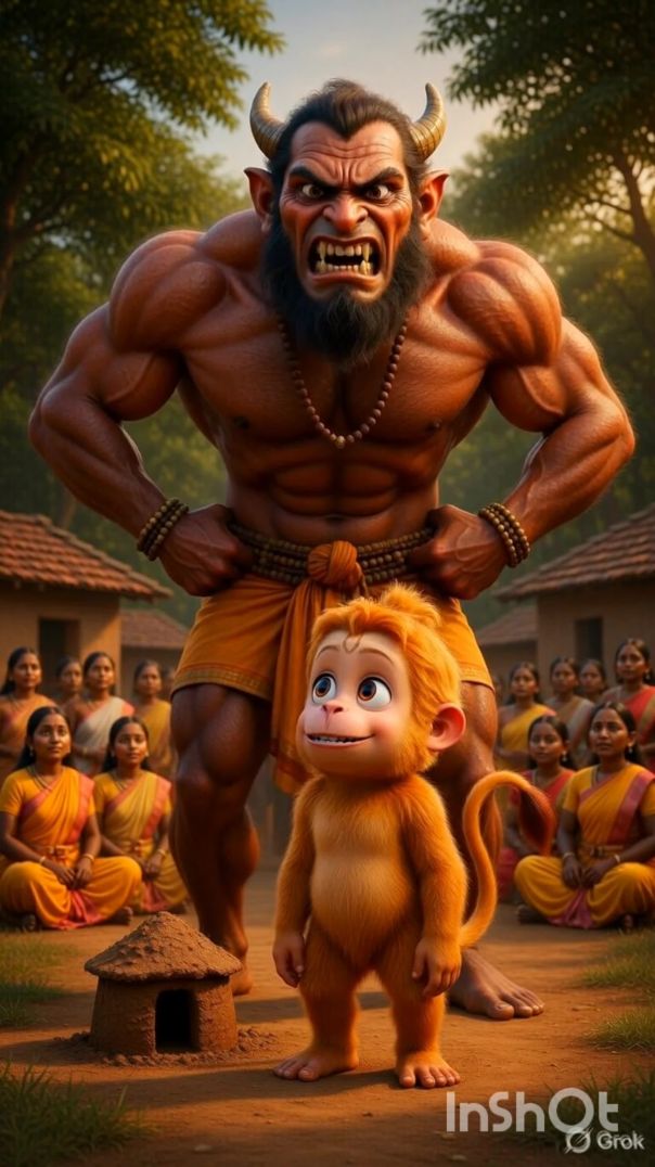 ⁣गांव में एक दिन बच्चे के रूप में हनुमान जी मिट्टी से छोटी झोपड़ी बना रहे थे। तभी एक घमंडी राक्षस वहां आया और बोला कि वह इससे भी बेहतर झोपड़ी बना सकता है। अगले दिन दोनों के बीच मुकाबला हुआ। राक्षस ने बड़ी सुंदर झोपड़ी बना दी और अपनी जीत का जश्न मनाने लगा।
