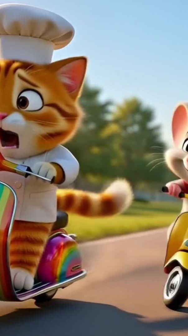 Is funny AI cartoon story me Chef Cat aur Chuha lagate hain zabardast scooty race, jisme kabhi Cat aage to kabhi Chuha jeet ke kareeb! 😆