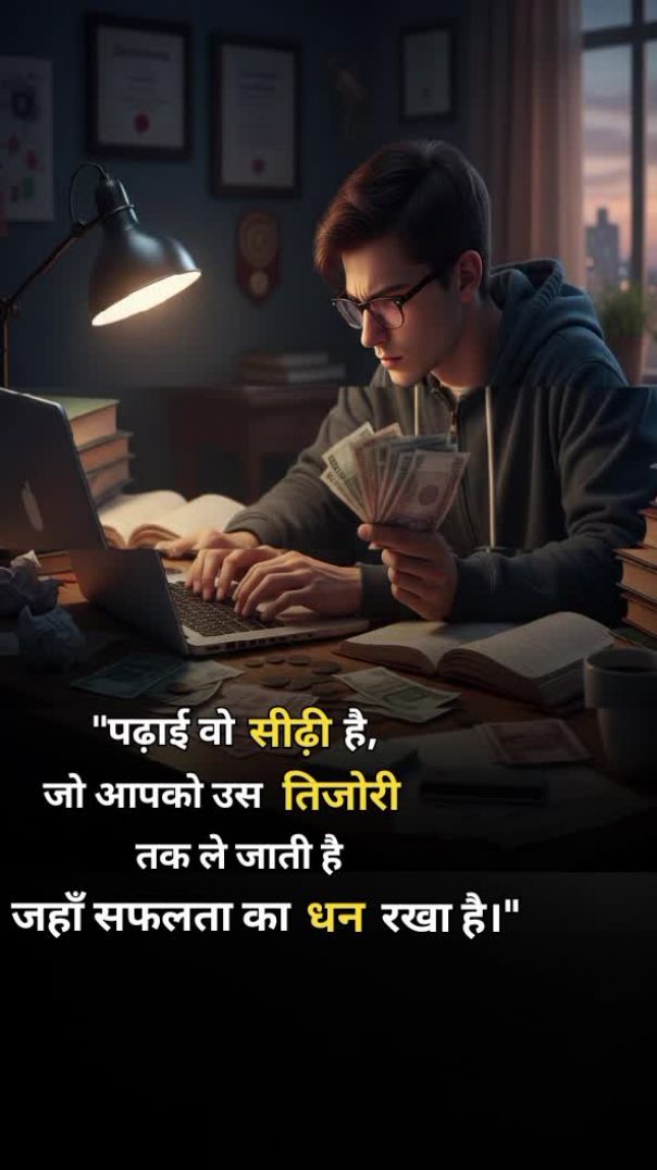 बहुत से लोग सफलता तो चाहते हैं, लेकिन उसकी सीढ़ी (पढ़ाई) से कतराते हैं। याद रखिये, ज्ञान वो निवेश है जिसका मुनाफा जीवन भर मिलता रहता है। अगर आज आप मेहनत की सीढ़ी चढ़ने को तैयार हैं, तो कल सफलता की तिजोरी आपकी होगी। खुद को प्रेरित करें और आज ही एक कदम बढ़ाएं!