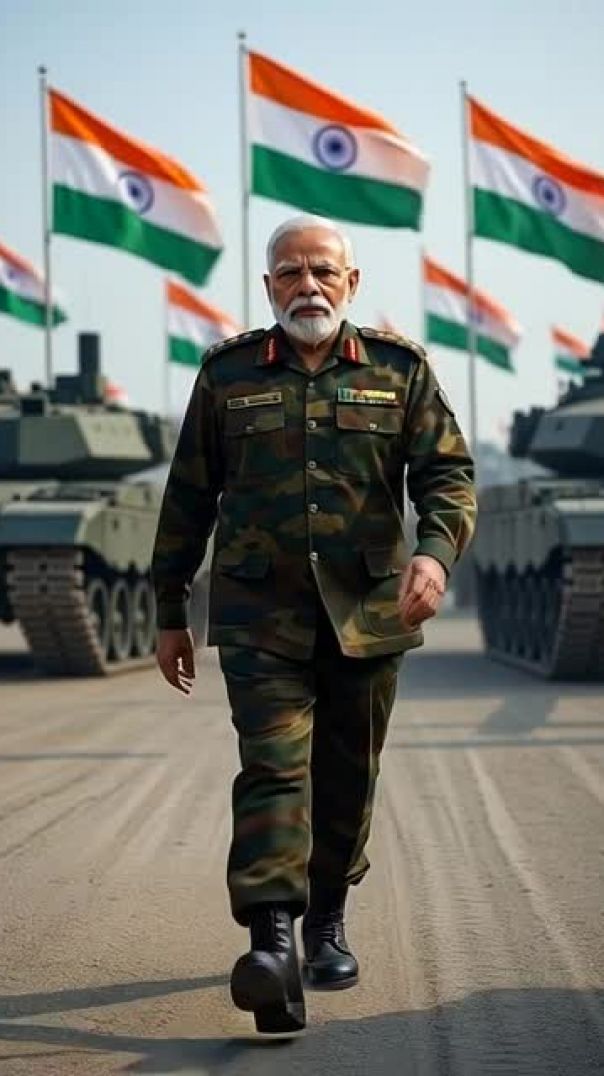 ⁣PM Modi Walking With Tank and Indian Flags AI Stock