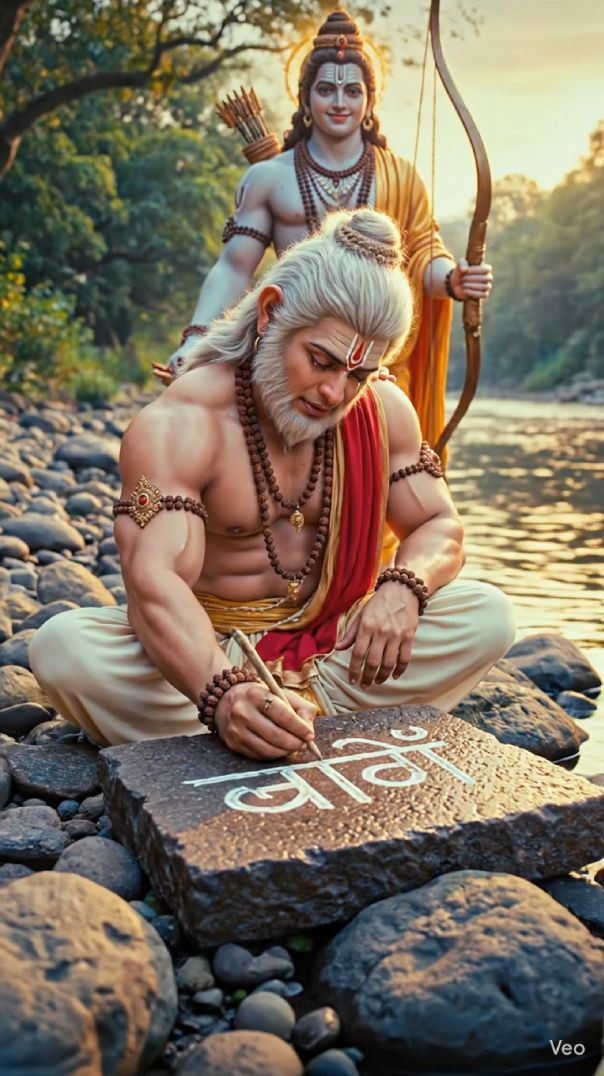 संध्या की पावन बेला में हनुमान जी राम नाम लिखते हुए पूर्ण भक्ति में लीन हैं, और प्रभु श्री राम स्वयं उन्हें आशीर्वाद दे रहे हैं।