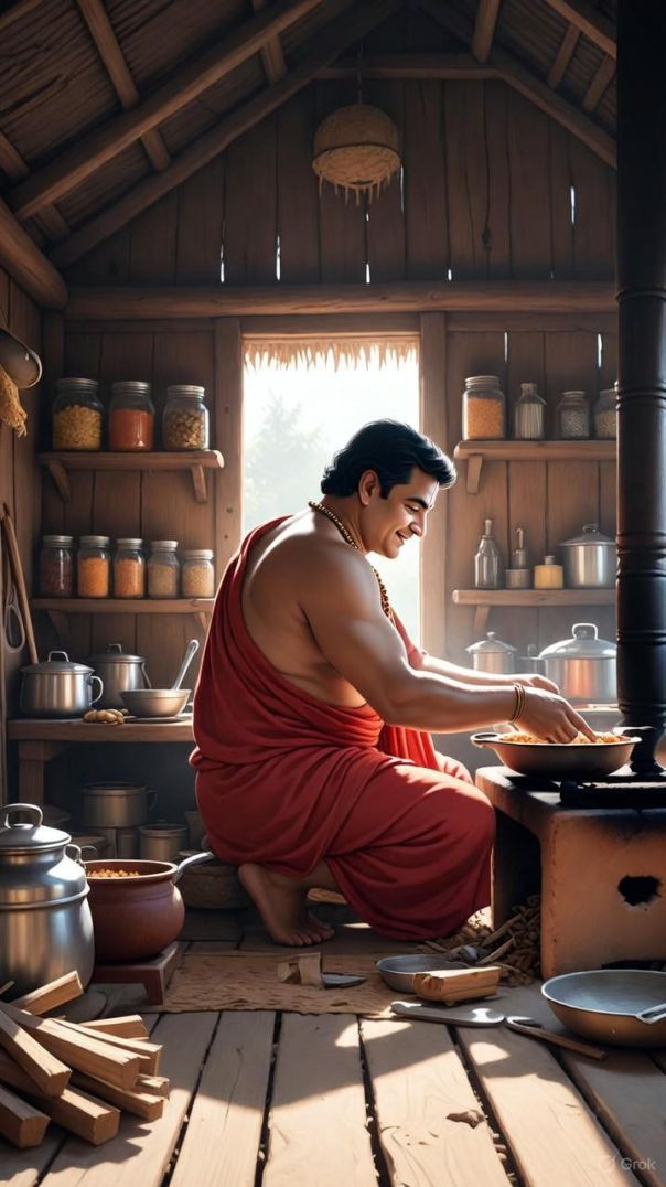 भोजन बनाने की तैयारी में जगन्नाथ और बलराम जी लकड़ियाँ जलाने में असफल रहे। भूख से दुर्बल दोनों भाई धुएँ से परेशान होकर बाहर निकले और अंततः भिक्षा में पका भोजन लेने का निर्णय किया।"