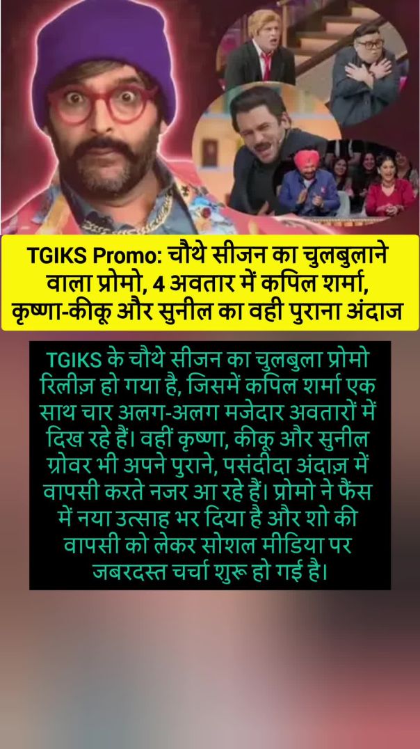 TGIKS के चौथे सीजन का चुलबुला प्रोमो रिलीज़ हो गया है, जिसमें कपिल शर्मा एक साथ चार अलग-अलग मजेदार अवतारों में दिख रहे हैं। वहीं कृष्णा, कीकू और सुनील ग्रोवर भी अपने पुराने, पसंदीदा अंदाज़ में वापसी करते नजर आ रहे हैं। प्रोमो ने फैंस में नया उत्साह भर दिया है और शो की वापसी को लेकर सोशल मीडिया पर जबरदस्त चर्चा शुरू हो गई है।