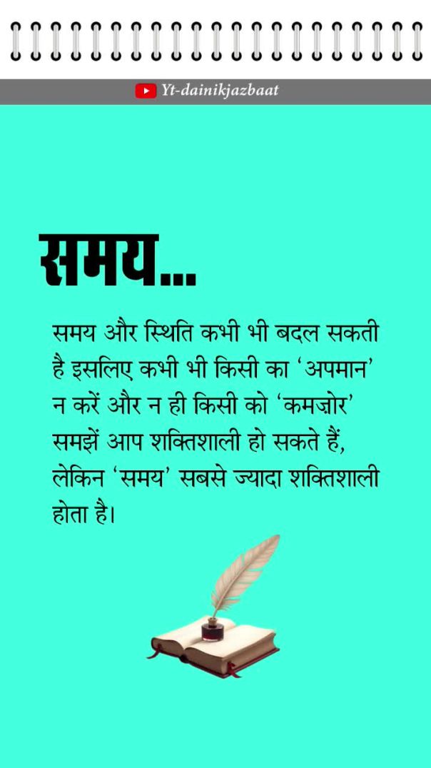 समय और स्थिति कभी भी बदल सकती है इसलिए कभी भी किसी का 'अपमान' न करें और न ही किसी को 'कमज़ोर' समझें आप शक्तिशाली हो सकते हैं, लेकिन 'समय' सबसे ज्यादा शक्तिशाली होता है...