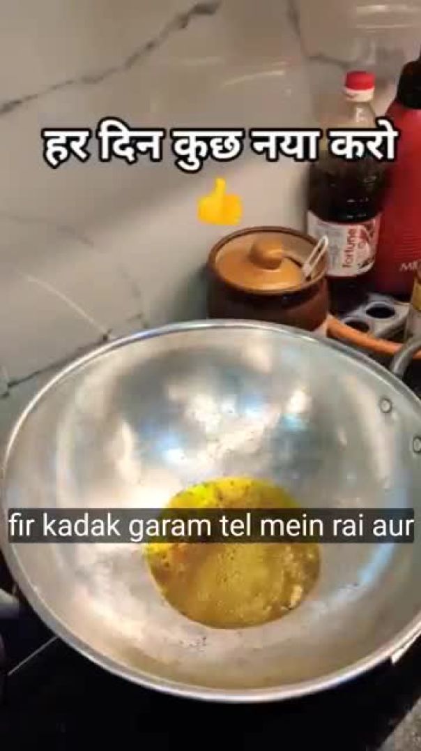 ​Garam tel mein rai aur sukhi laal mirch ka tadka lagayein.