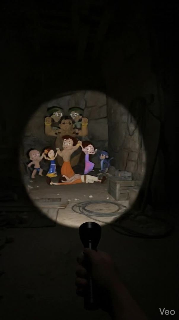 • The second moment reveals only part of the character at the edge of the flashlight beam — a damaged, dirty face or feature barely visible, creating an uncanny sense of recognition.