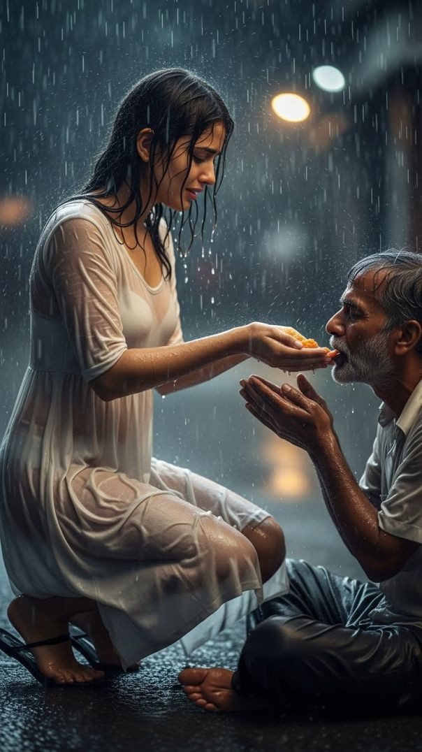 Is 8 second ki chhoti si kahani mein dekhiye kaise barish mein bheegi ek beautiful Indian larki, white one-piece pehne hue, ek 58 saal ke bhookhe aadmi ko khana deti hai.