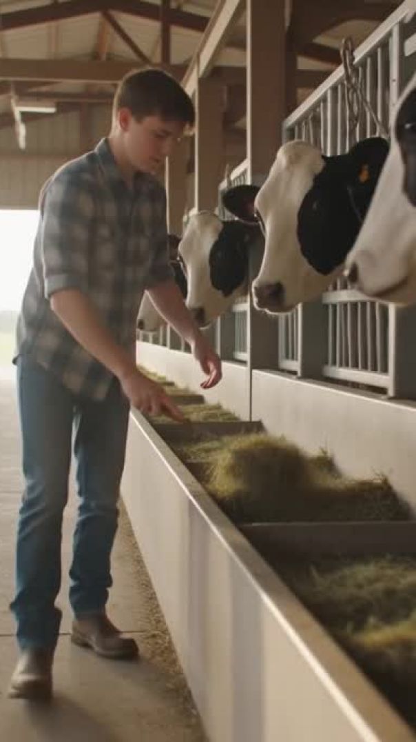 Watch a teenage farm boy walk through a modern American dairy barn, spreading fresh hay along the feed bunk while Holstein cows line up to eat. Experience the peaceful daily routine of real farm life in the United States, with sunlight gently streaming through the open-sided barn.