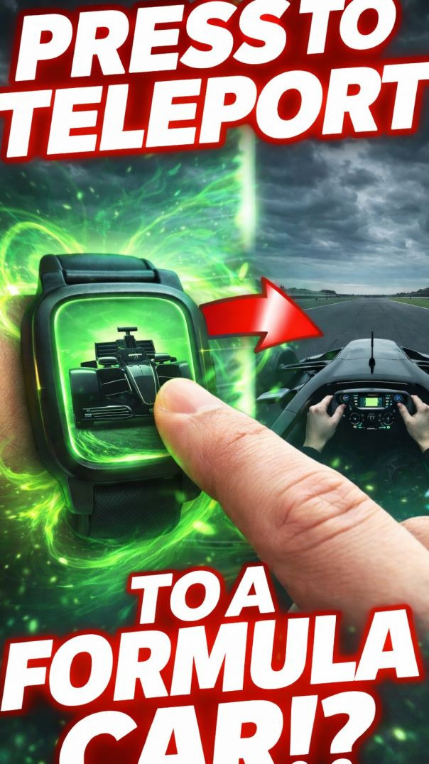 Watch ke green glowing screen par Formula car ka image clearly dikhta hai.